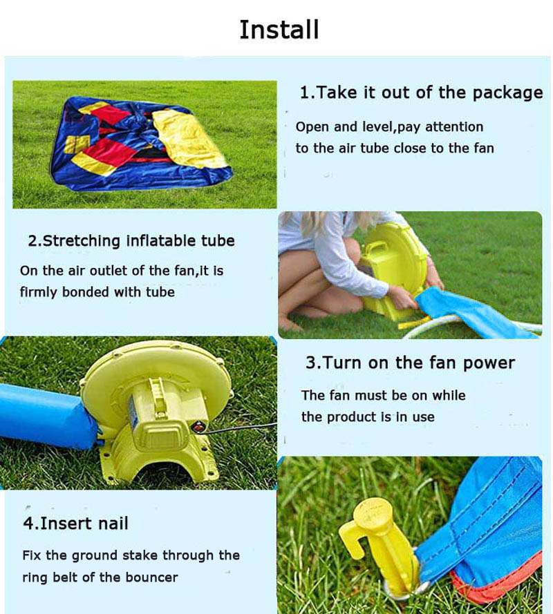 Material:Strong PVC tarpaulin for jumping area,PVC nylon oxford for other parts
