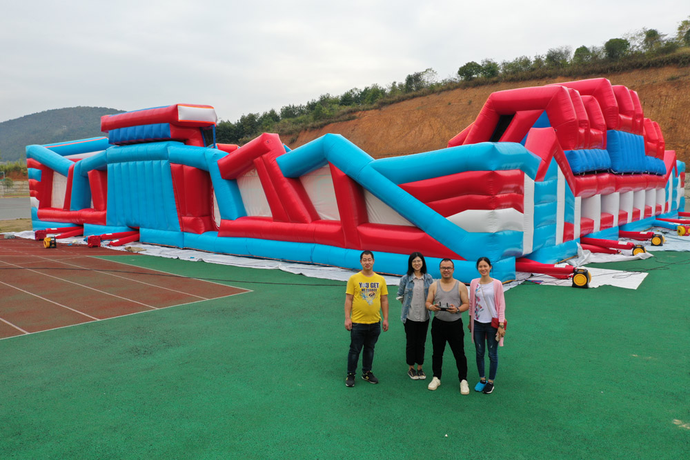The large scale inflatable obstacle course inflated for inpection,they check every details,sewing,durability,D rngs,printing,zipper and others.This kind of commercial use bouncers is common for outdoor sports adult and children. It is ideal for parties, events, recreation centers,races and more.
