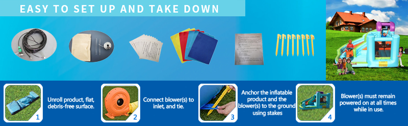 ●Quick Inflation- Coming with heavy duty air blower and instruction, easy to set up and take down, only inflated less than 2 minutes, keep the blower running while playing.